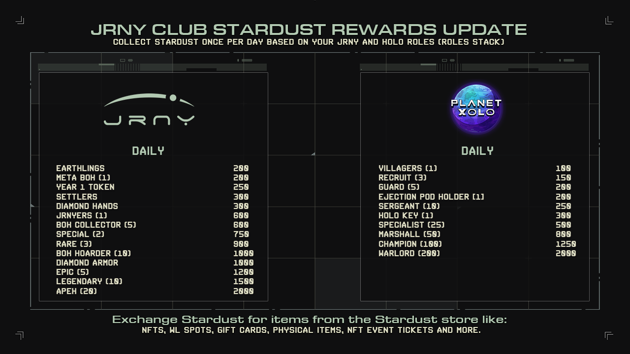 > Stardust is the JRNY Club Discord server-based currency. NO purchase necessary to earn Stardust; you just need to join the server. The more roles you get, the more daily Stardust you can collect.\
